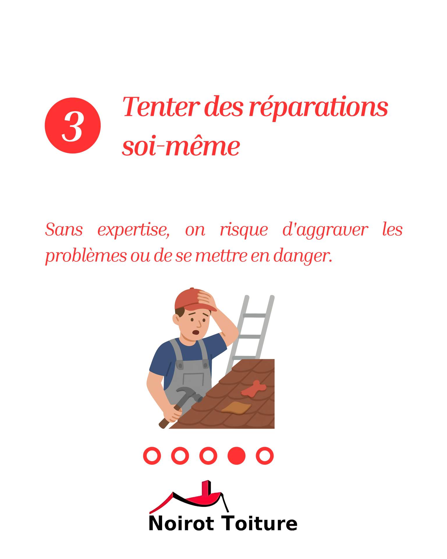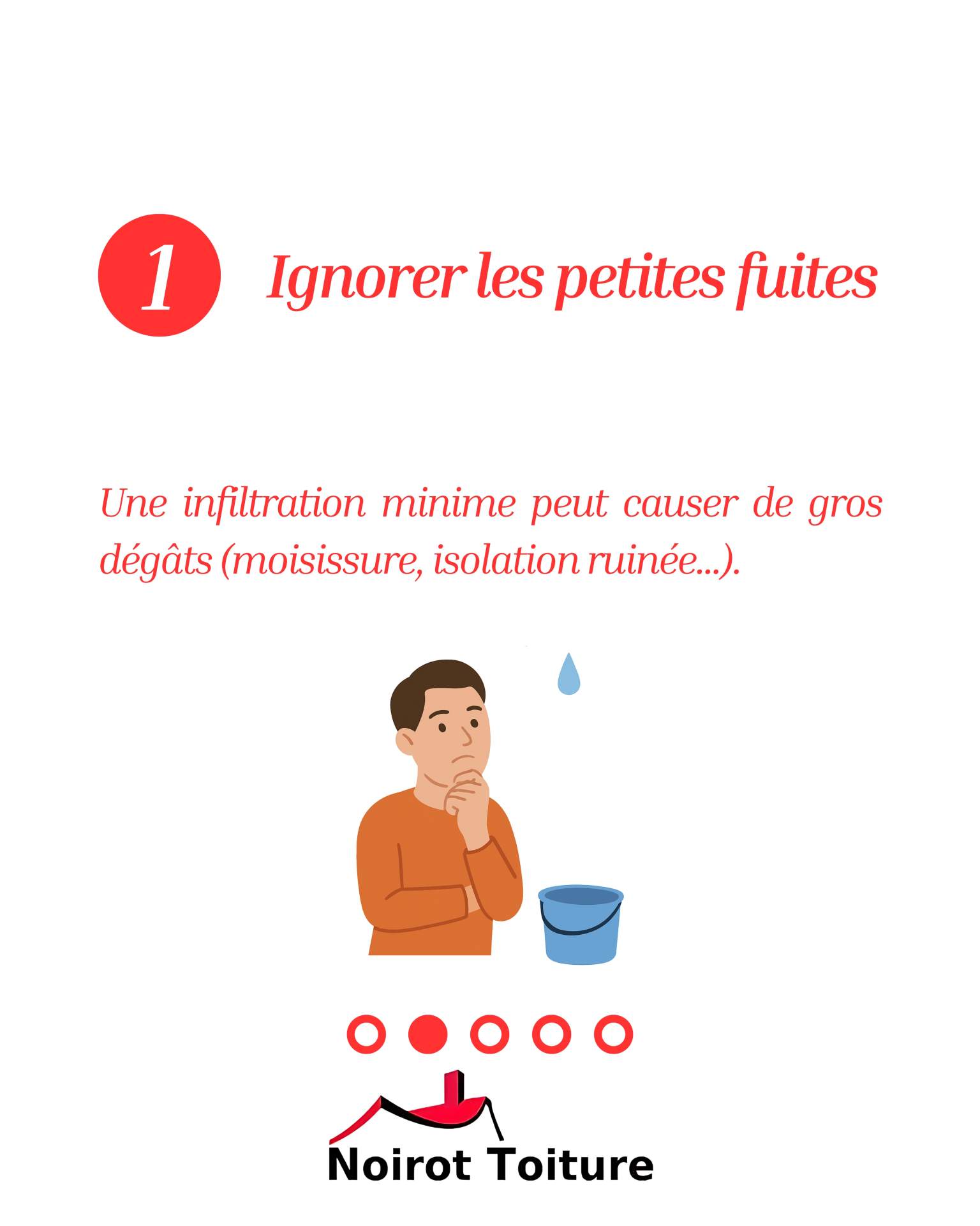 1. Ignorer les petites fuites Une simple goutte d'eau peut sembler inoffensive, mais une infiltration même minime est le signe d'un problème qui peut rapidement s'aggraver. Moisissures, détérioration de l'isolant, affaiblissement de la charpente... N'attendez pas que les dégâts deviennent importants pour agir.