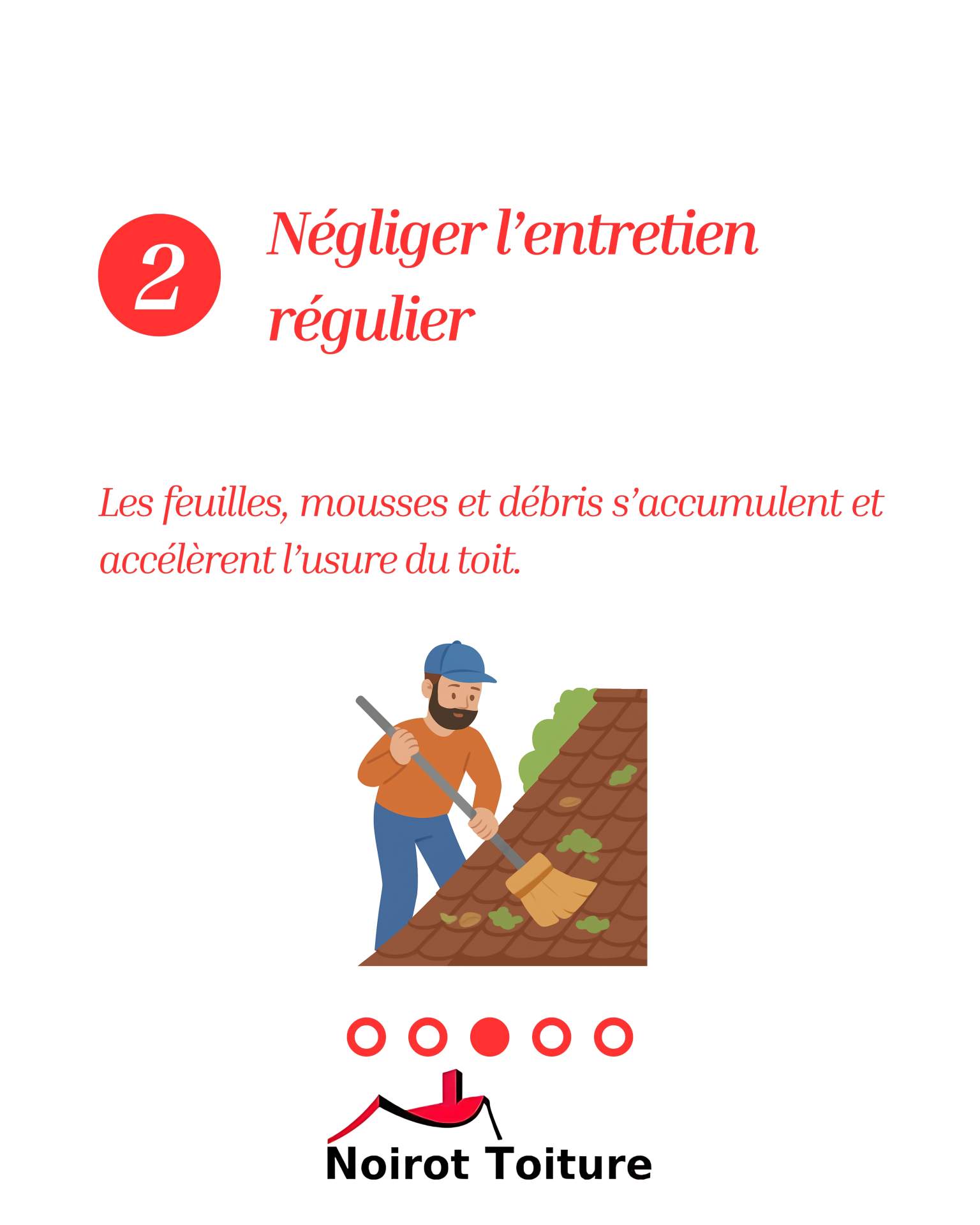 2. Négliger l'entretien régulier Les feuilles mortes, la mousse et les débris qui s'accumulent sur votre toit retiennent l'humidité et accélèrent l'usure de vos matériaux. Un nettoyage et un contrôle réguliers sont essentiels pour garantir la longévité de votre toiture.