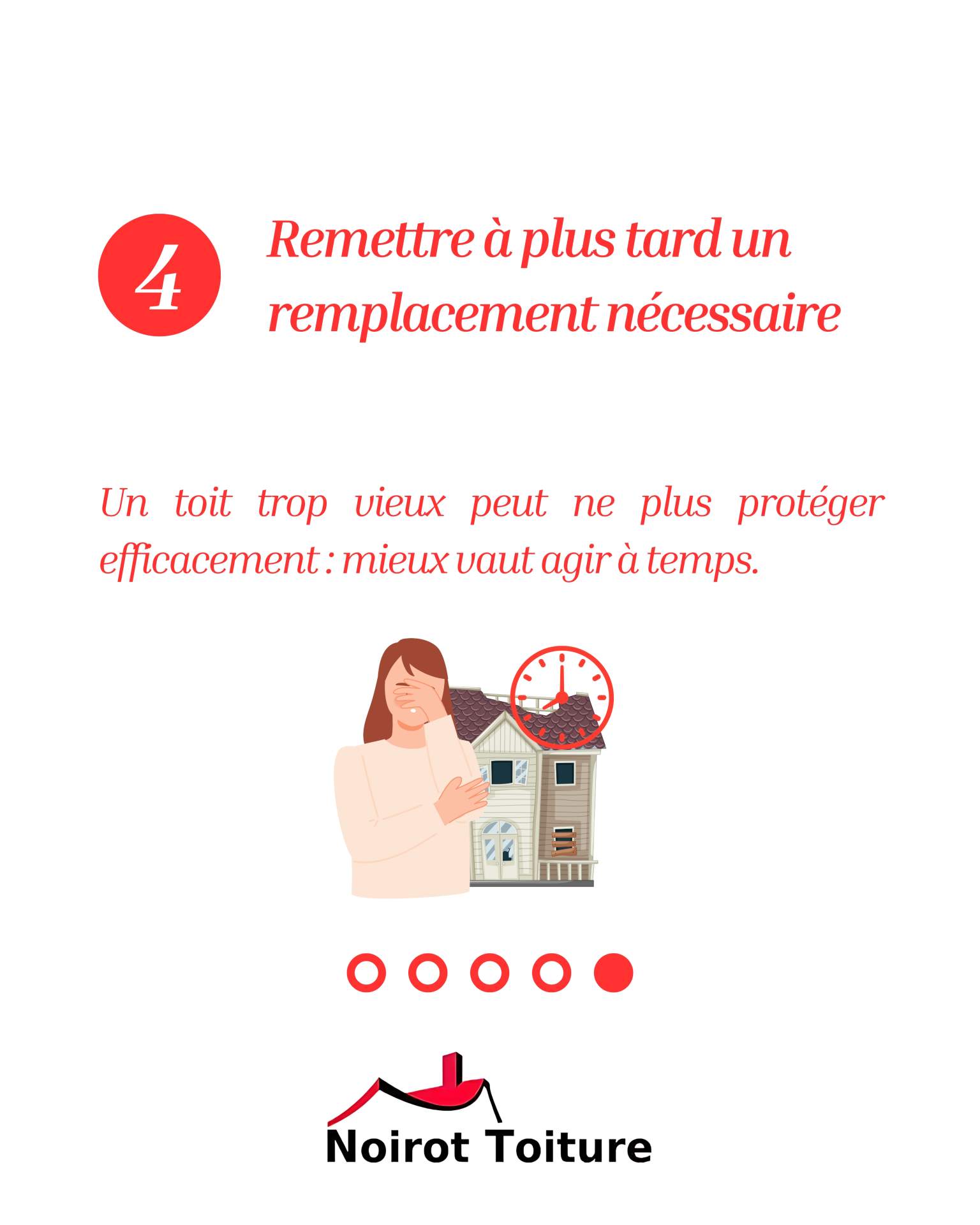 4. Remettre à plus tard un remplacement nécessaire Une toiture a une durée de vie limitée. Repousser son remplacement lorsque celle-ci est trop vieille, c'est prendre le risque qu'elle ne protège plus efficacement votre habitation contre les intempéries. Mieux vaut agir à temps pour éviter des complications.